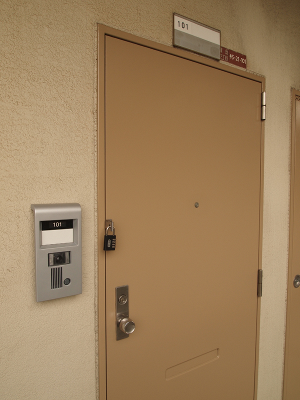 101号室の前へ来ました。(錠前は空室だけに付けられています)