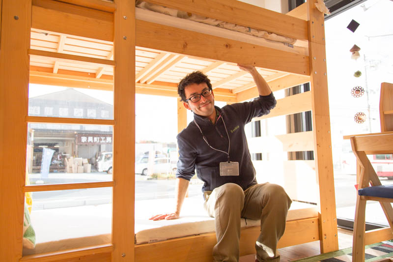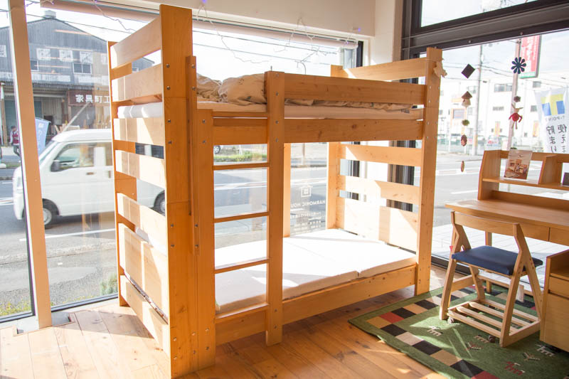 この2段ベッドは和歌山県産のヒノキを天然オイルで仕上げたもので、安全なだけでなくリラックス効果もあるそうです。