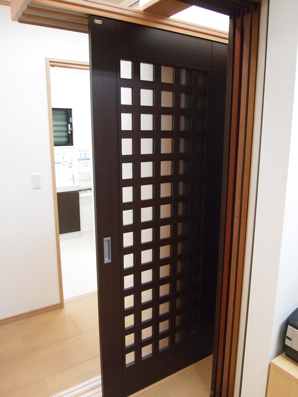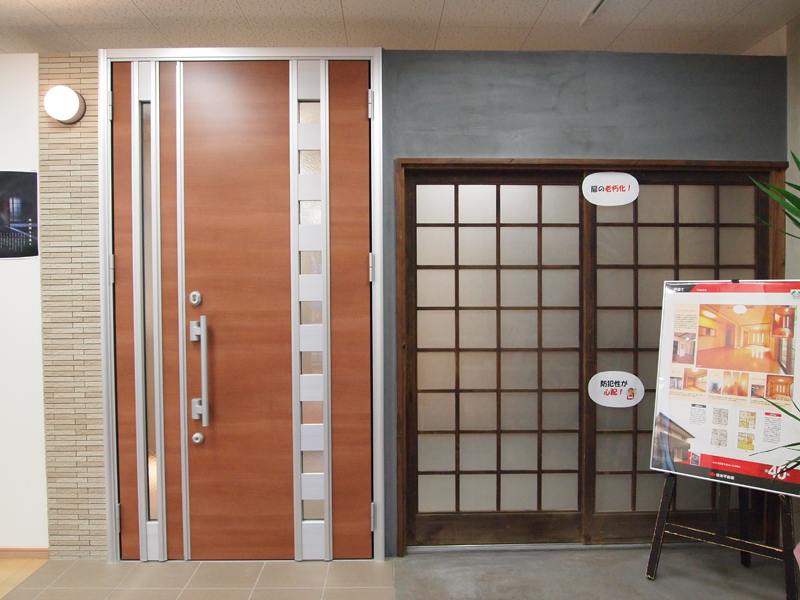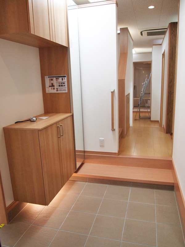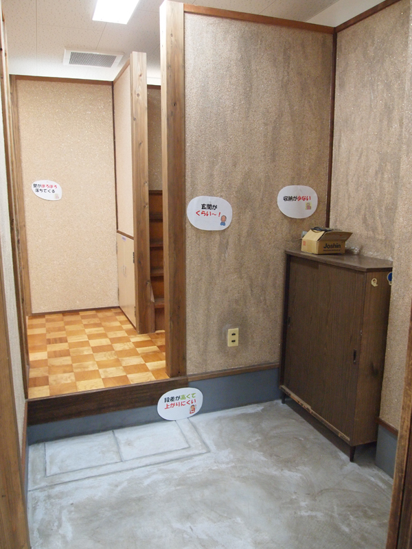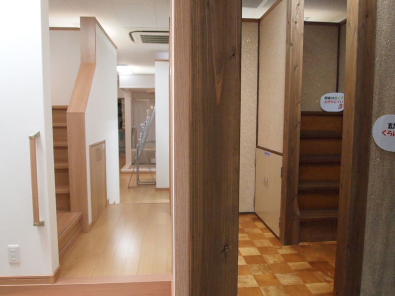 古い玄関と新しい玄関が並んでいます。古い玄関の方が今住んでいる家、つまり「現在」。新しい玄関の方が新築そっくりさんで生まれ変わった「未来」。どう変わったのかを見比べることができます。