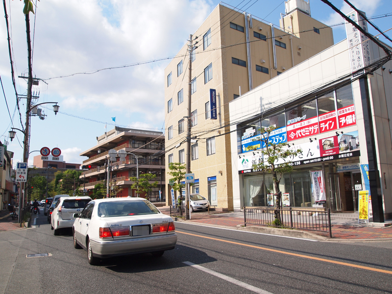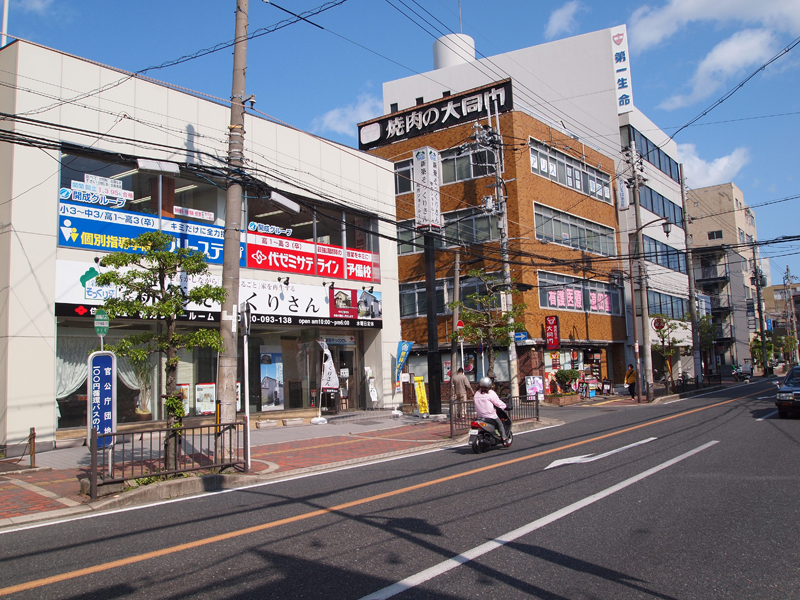 あの信号のところが「枚方市役所東」交差点。真っ直ぐ行けば枚方市駅です。