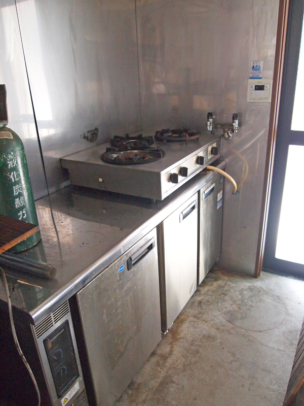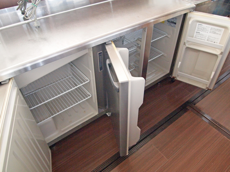 イスが積み上げられています。ガラス扉の冷蔵庫もありますね。