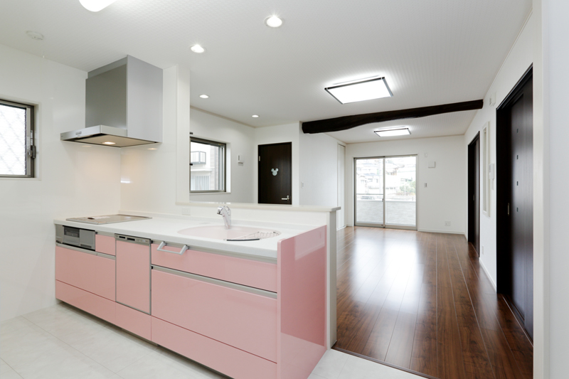 キッチンはL字型の対面式に!色もカワイイですね~