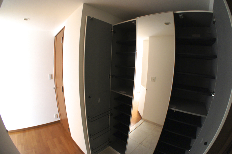 入ってすぐには収納力たっぷりの靴箱。姿鏡で身だしなみチェックもバッチリ