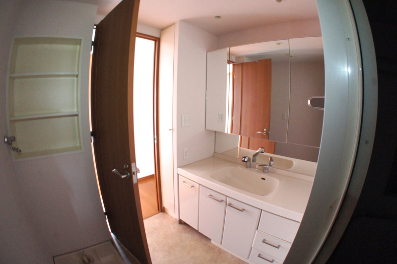 まずは手前の洗面所から。二人並んでも十分余裕な洗面台。洗濯機はこちらに置きます。