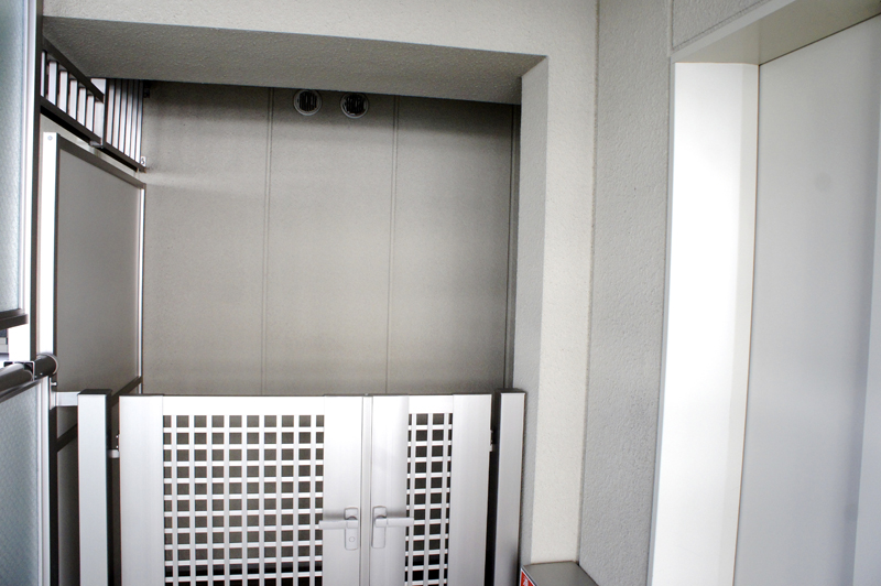 窓を開けると、バルコニーがあって吹き抜けがあります。ポーチや吹き抜けがこの時は「?」だったのですが、共有部分の廊下から空間があるのはセキュリティ面やプライバシー面を考えてのことだと後で気づきました