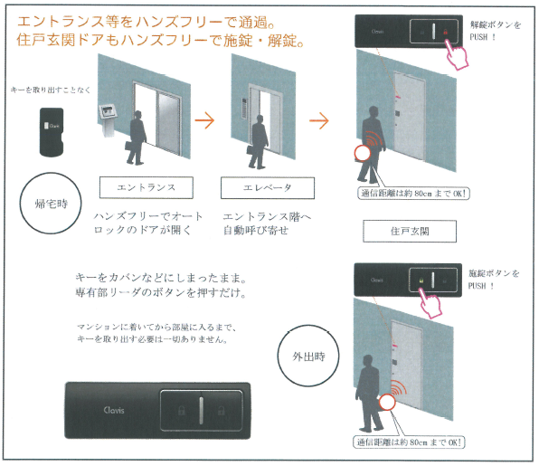 キーは収納型で、ワンプッシュで出てくる構造になっています。さらにこのキーはカバンやポケットから取り出すことなくエントランスや玄関ドアをハンズフリーで解錠できちゃうんです。