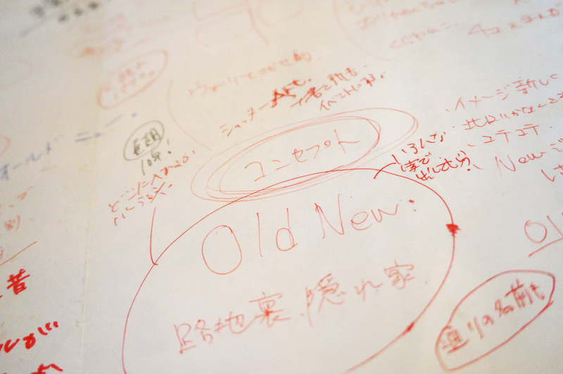 上のメモに「路地裏」「隠れ家」というキーワードが書かれてますが、「大人」や「シブい」というイメージもありますね。「Old New」ってまさに川原町にぴったりの表現じゃないでしょうか。