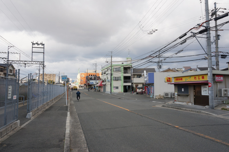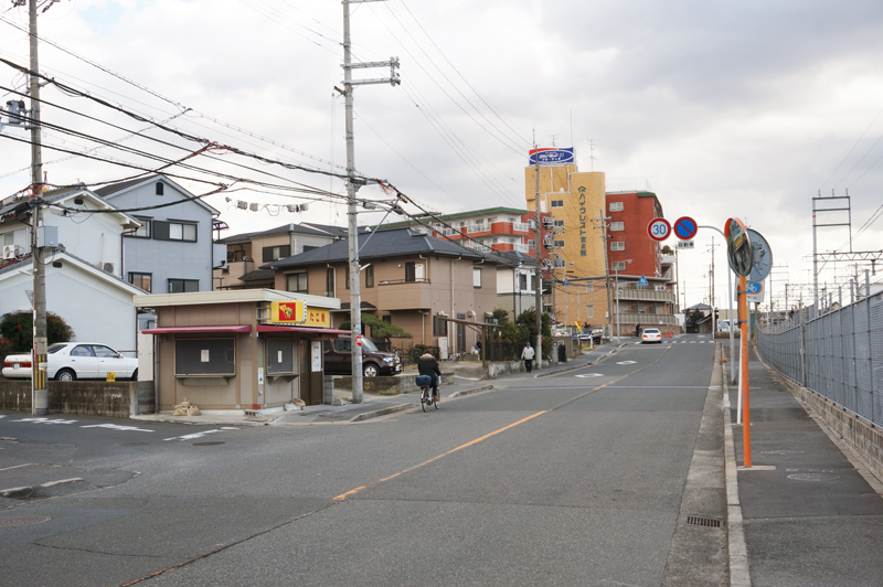 こっちに行くとすぐ右手にサンディがあって、宮之阪駅の前を通ってイズミヤ枚方店のほうへ。向かいは京阪交野線の線路。