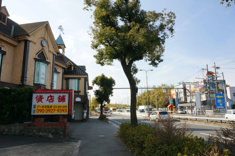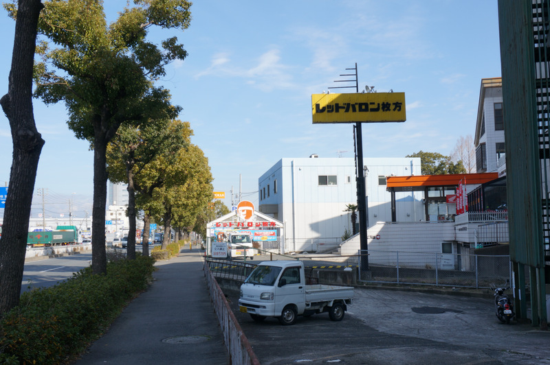 あっちが国道1号の大阪方面で、少し行くとお好み焼き「銀の卵」とかサイゼリヤとか枚方自動車教習所があります。