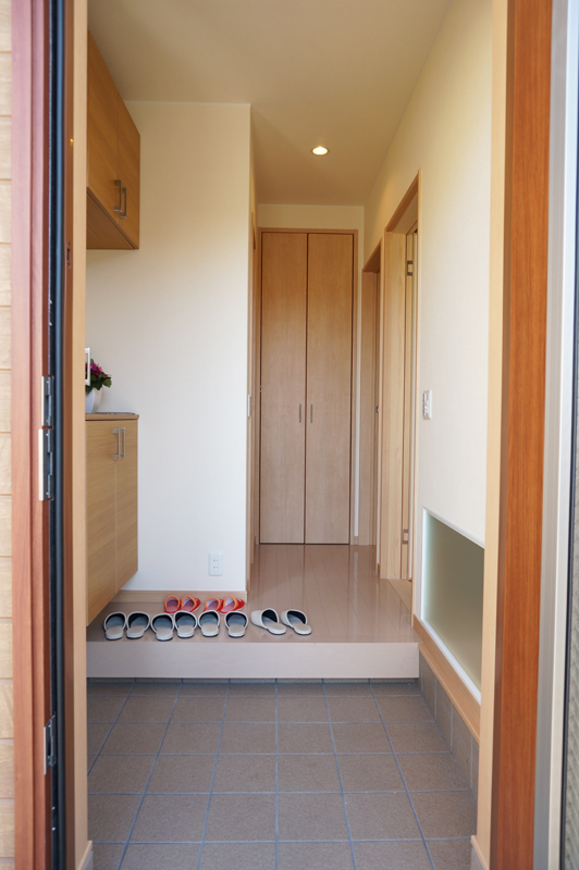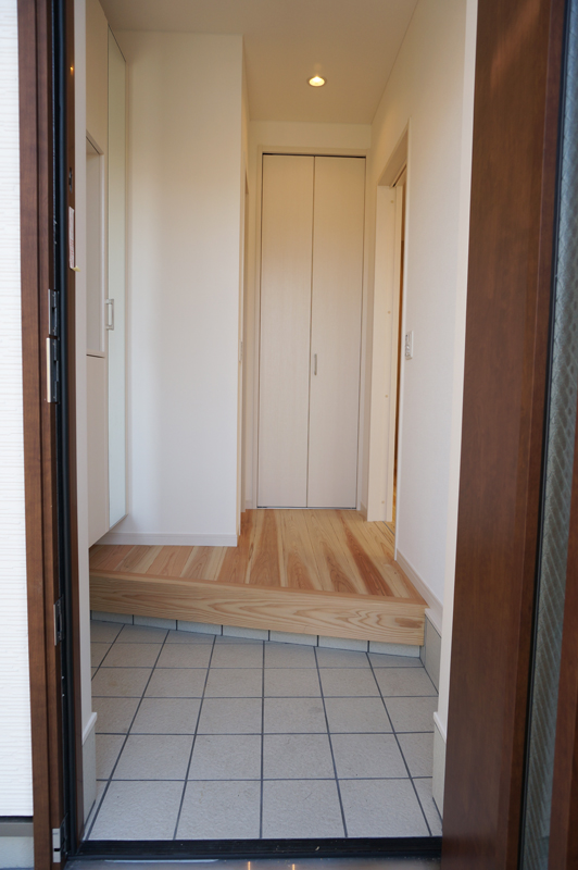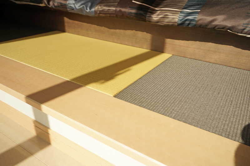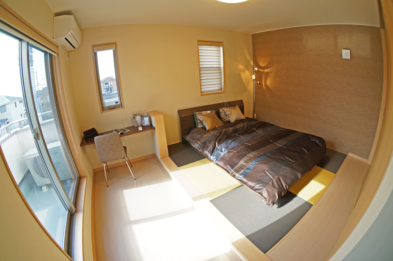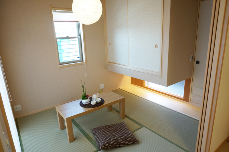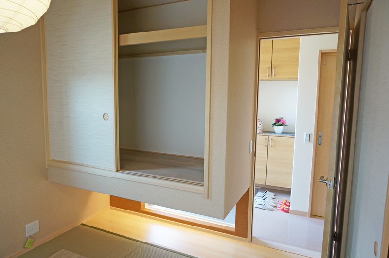 吊り押入れで下に空間を作ることで光が入ってきて明るくなりますね。この和室は玄関から直行OK。