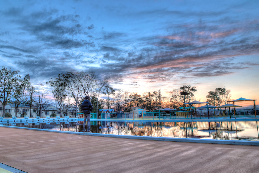 空と、それを映し出す水面ももちろんですが、施設そのもののカラーも夕日でいい案配に調整されてて、もはや記憶の中の王仁プールと一致しません(笑)