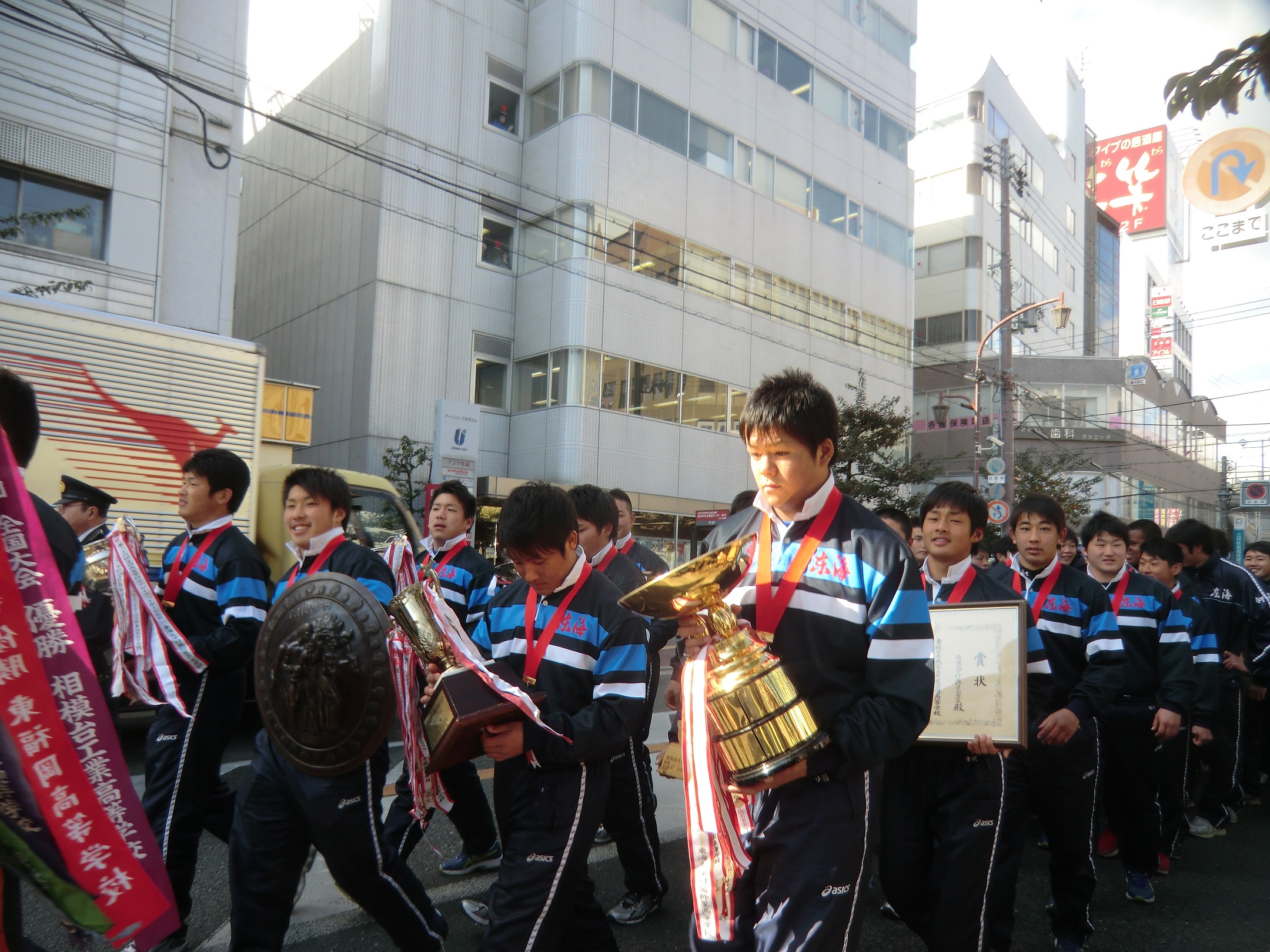 高校ラグビー全国一位 優勝パレード枚方市駅前を凱旋中です。