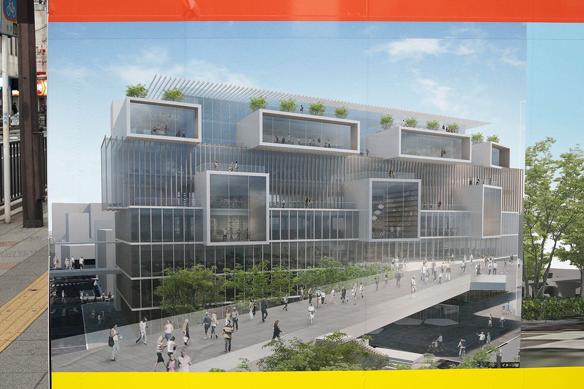 現場の仮囲いには新たに建設される新商業施設の完成予想イメージがたくさん貼りだされています。