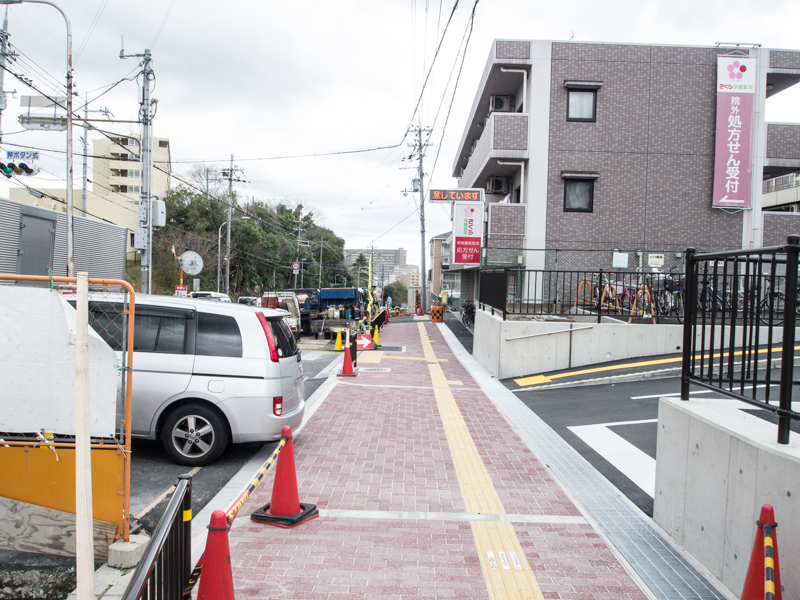 枚方市民病院(市立ひらかた病院)前の歩道が一部完成してる