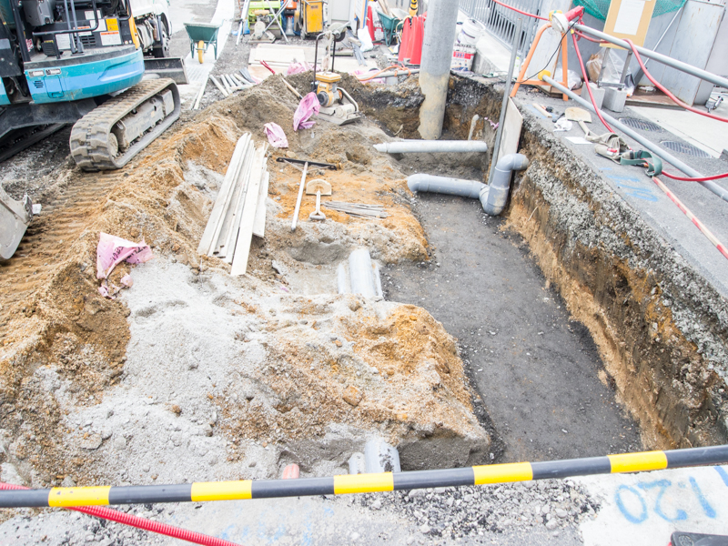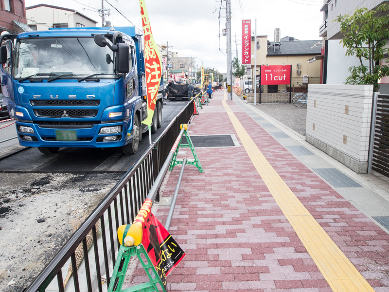 イレブンカット前付近。歩道はできていますが道路は工事中です。