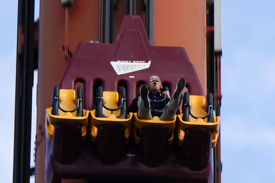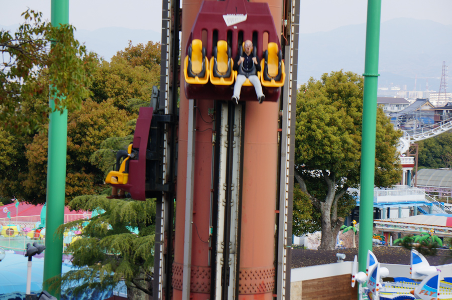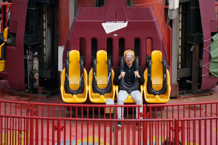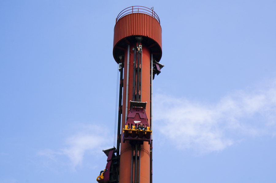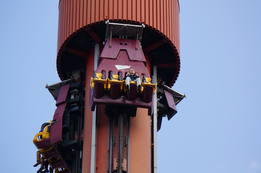 まずチャレンジするのはこちらの「ジャイアントドロップ メテオ」!ぐーんと約50メートルのてっぺんまで上がって、一気にストーンと垂直に落ちるやつです。考えただけでおしりがキュッとなりますね。