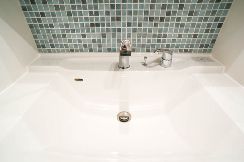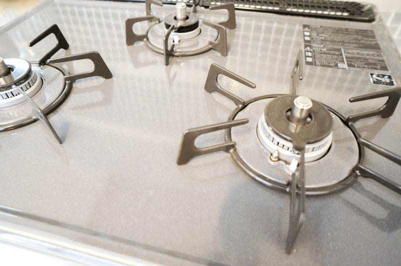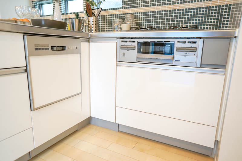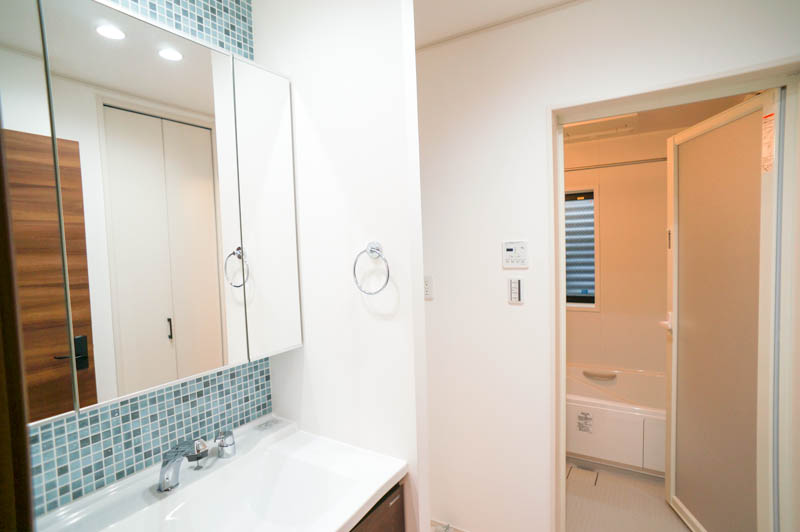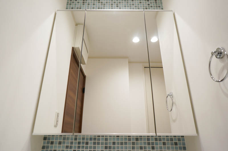 上にも大きな収納スペースと立派な換気扇があります。青の細かいタイルも可愛らしいですね