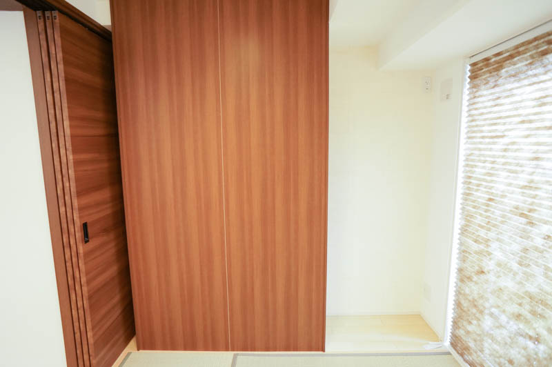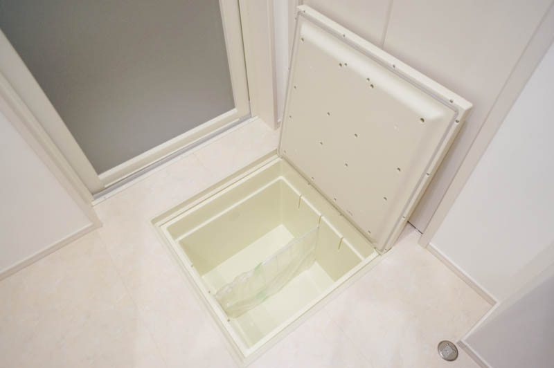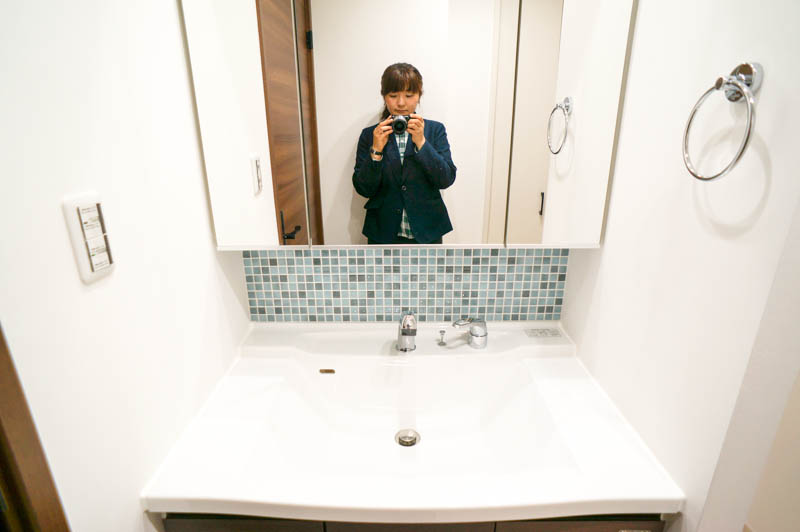 開けるのに躊躇ってふと振り返ると、先ほどの広い収納スペースが見えています。右の壁には鏡が埋め込まれています!