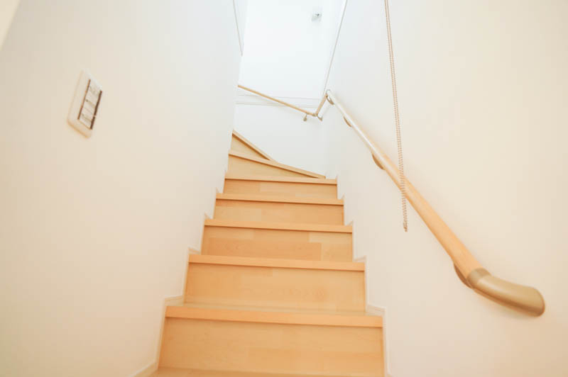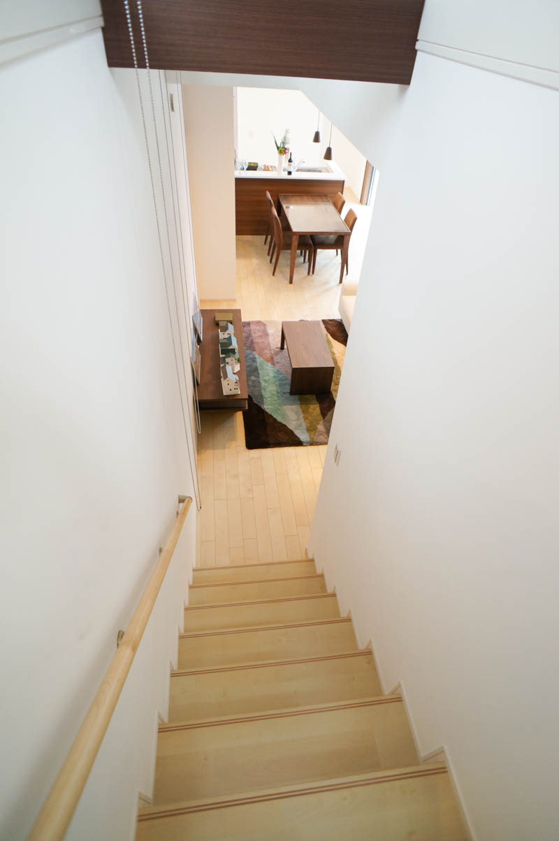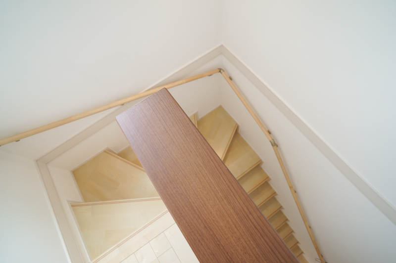 優しい質感の木材です…。右の写真は階段の上から。空間の使い方に全く無駄がありませんね。私の実家もこの形の階段なのですが、この形の階段はもし滑って落ちても半分で止まるからいいのよ!って昔母が言っていたのを思い出しました