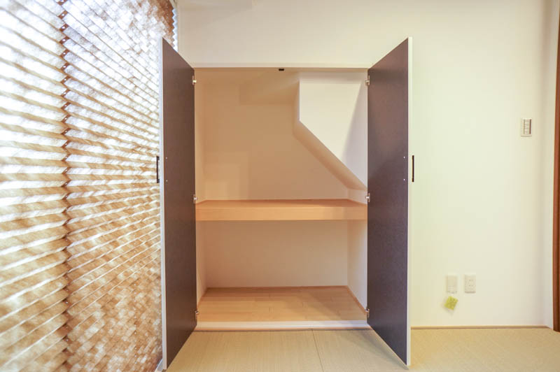 先ほどちょこんと、と表現しましたが中にはびっくりする程大きな収納スペースがあります。いわゆるデッドスペースを最大限収納場所にしている工夫がいっぱいなんですね。