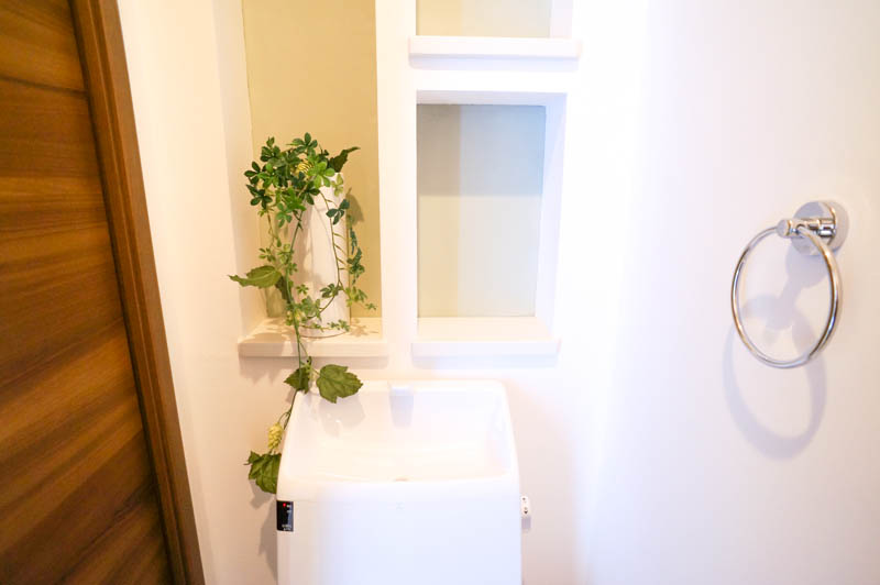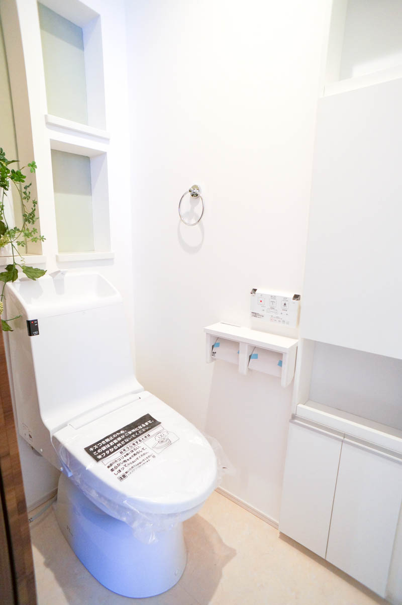 続いてトイレ。グリーンも置けてステキ。そしてここにも収納スペースがたっぷり!ペーパーホルダーも2つあります