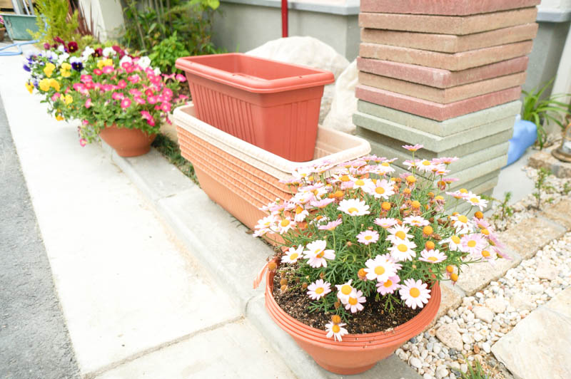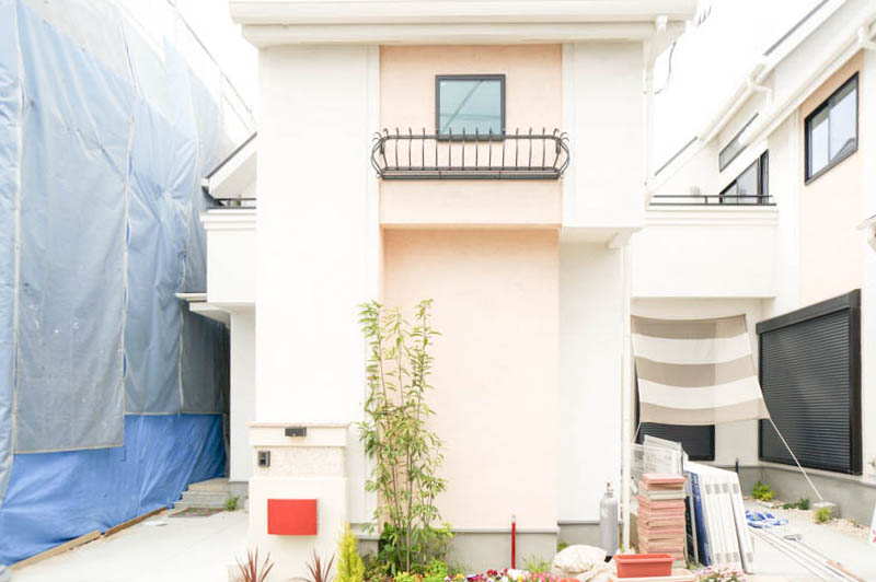 白壁にパステルピンクの縦ラインが映える、ちょこんと可愛らしいおうちですね。