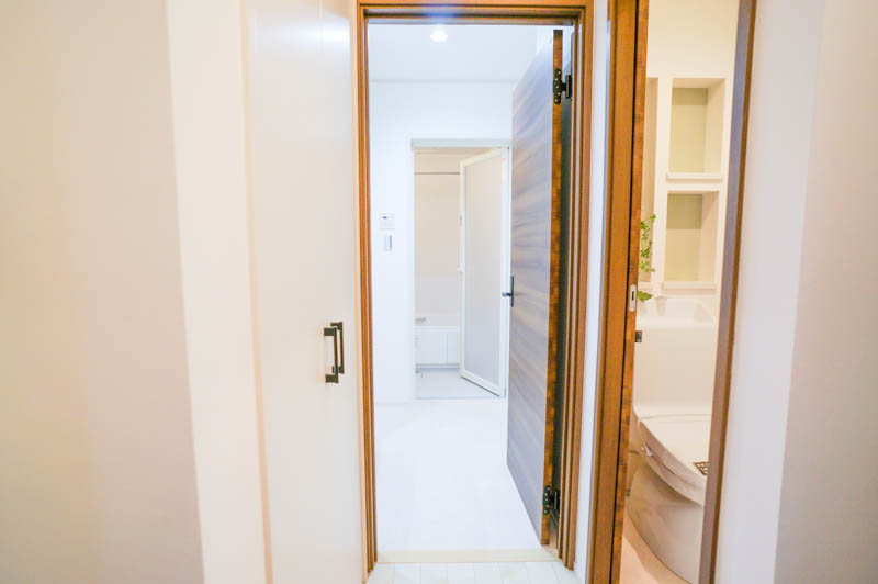 手前からトイレ→収納スペース→洗面所→お風呂となっています。