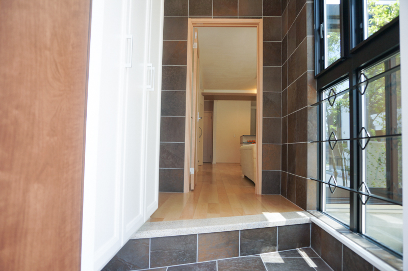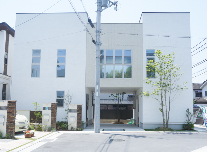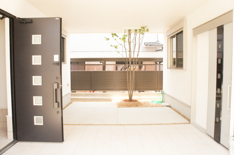 オーベルジュ磐船は、全13邸の街ですが、11号地は、分譲地の中でも他と異なる造りになっており、2つの玄関を用意することで、主寝室側で趣味の教室を開くこともできますし、中央のインナーガレージから、雨に濡れず、左右どちらの玄関へも荷物が運べる設計になっています。