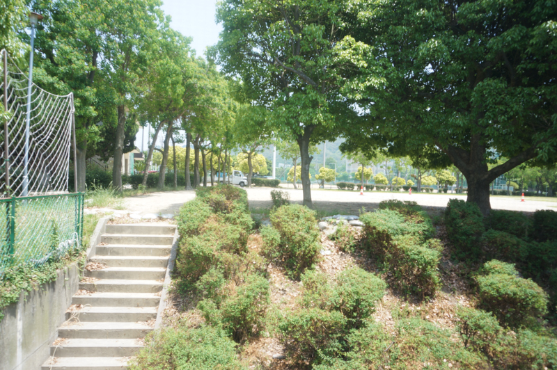 すぐそこに私部公園が見えます。(手前の広場は駐車場と管理室です)向こうには野球場もあるので、あの階段から