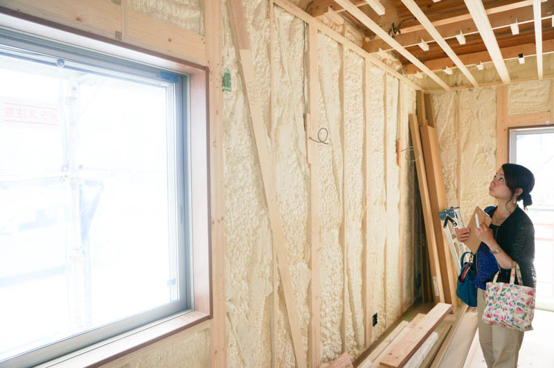 ①現場吹付け発泡で家全体をすっぽり覆う断熱工事なので、天井部分などの隙間にもピタッと防いでくれます