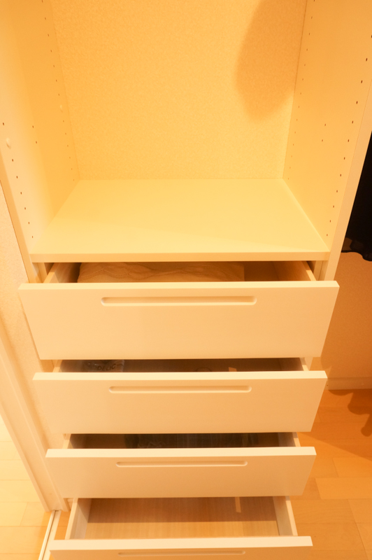 ハンガー類もワンピースやロングコートなど丈の長いもの、シャツなど短いものと分けられるようになっています。そして、引き出し収納もついているので、ベルトなんかの小物もしまえますね