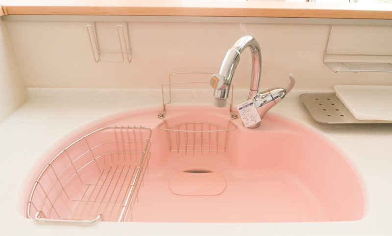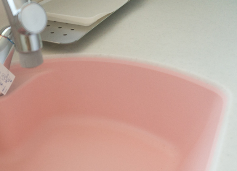 かわいい半円形のシンク。ステンレスじゃないのかな?形だけじゃなくて色も可愛らしいですね〜