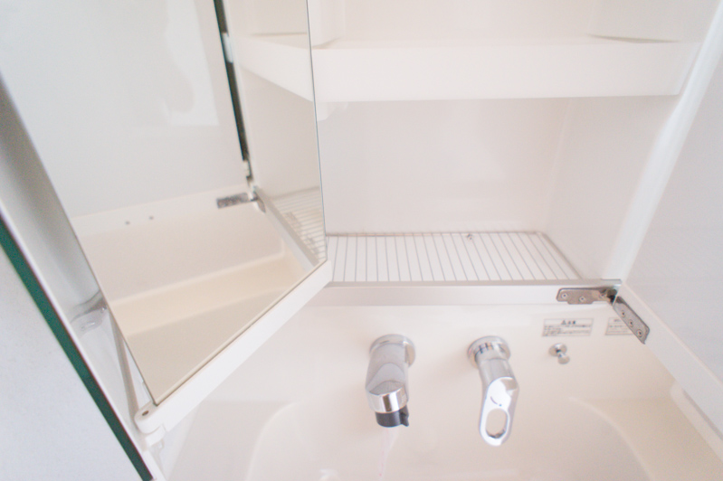 3面鏡の裏の下段はメッシュになっていて、水切りも出来るうえ、通気もいいので歯ブラシや掃除スポンジなんかも置けそうです。