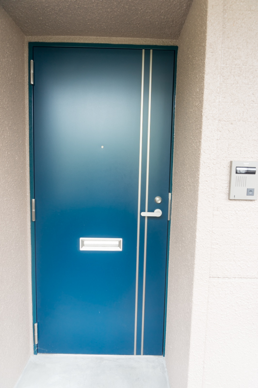 玄関ドアがブルーでおしゃれな感じ