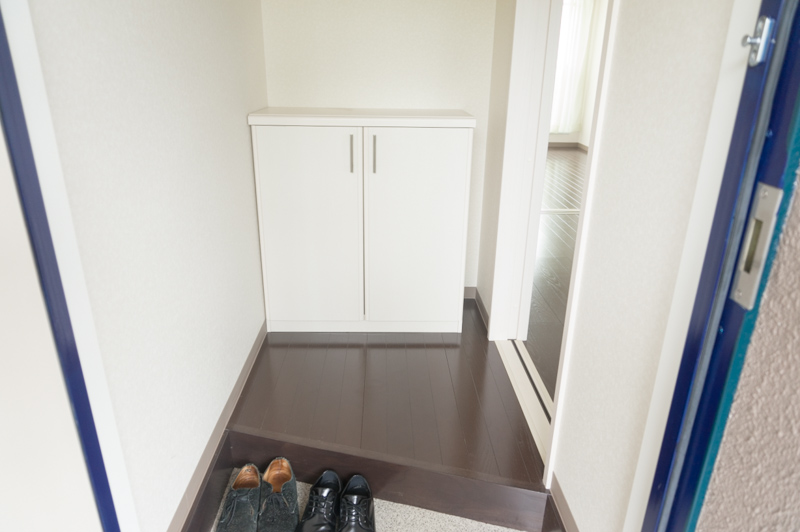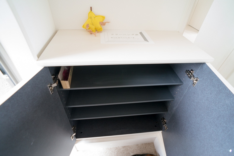 靴箱。ご夫婦2人分+小さなお子さまの靴がちょうど収まるサイズ