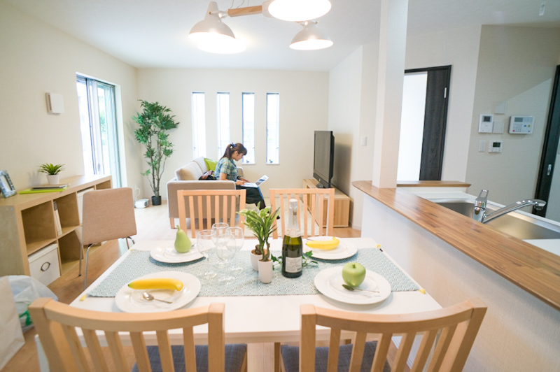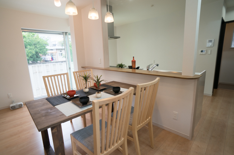 ダイニング。1、2号地ともに床暖房が装備されています!キッチン下に1帖分、ダイニングテーブル部分に2帖分、リビングに4.5帖分あるんです!(1、2号地同様)