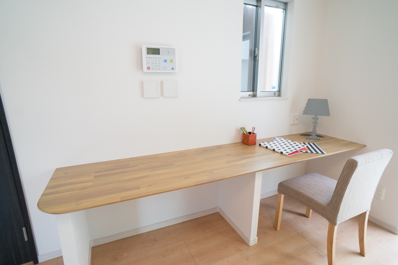 リビング横に大きめのカウンターデスク。最近はリビングで勉強したほうが良いなんていう話も出ています。お子さんのお勉強スペースにちょうどいいですね