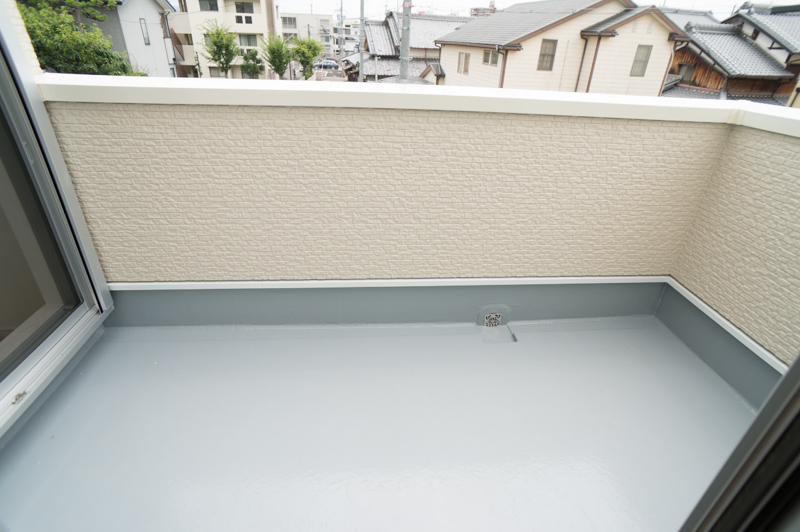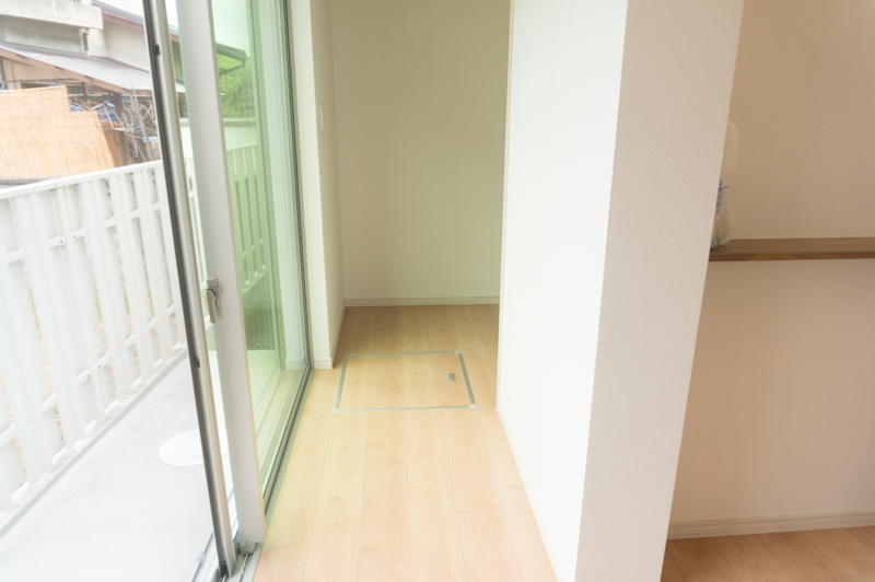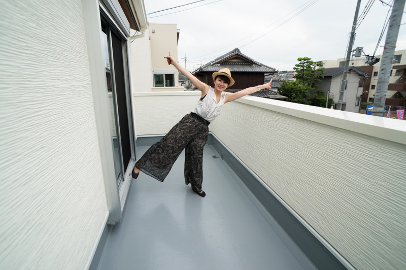 光の方へ・・・外に出るとちょっとしたデッキスペースになっています。洗濯物を干したり、お子さんの遊びにしたり、小規模バーベキューパーティも開けます