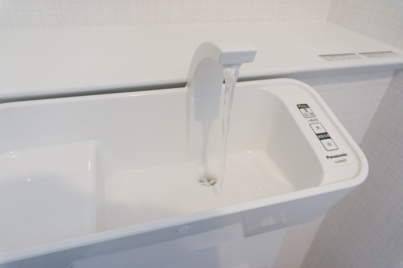 玄関入ってすぐにトイレがあります。手洗いがスイッチで水をコントロールできるようになっています