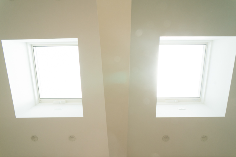 上の勾配天井からは、大きな窓から自然光が降り注ぎます。