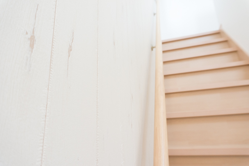 階段横の壁がDIYしたようなシャビー加工風になっています!!