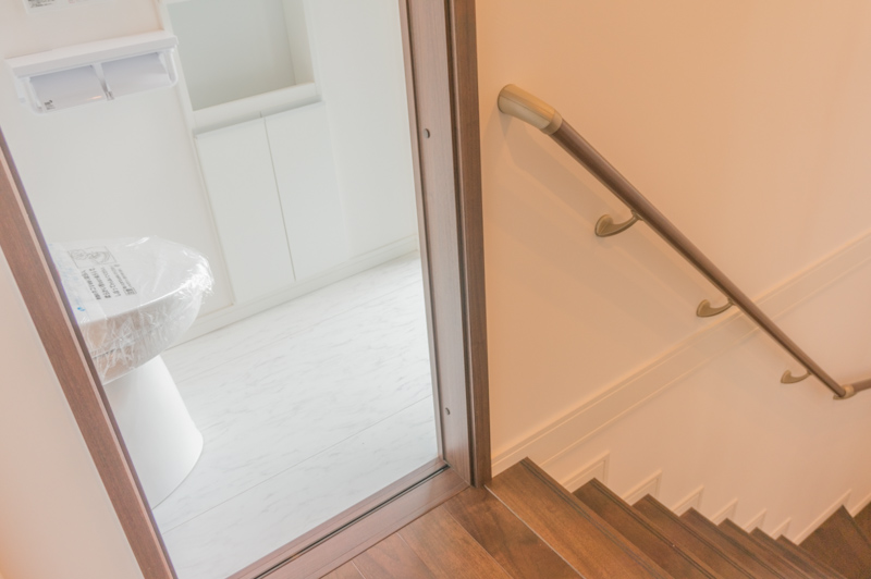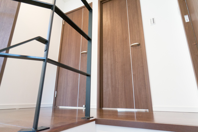 手前に階段、白い引き戸はお手洗い。