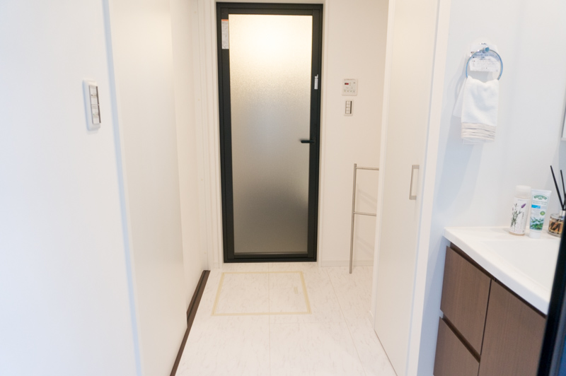 一旦キッチンに戻って、ちゃんと洗面所のドアから入ると、正面がランドリー収納。