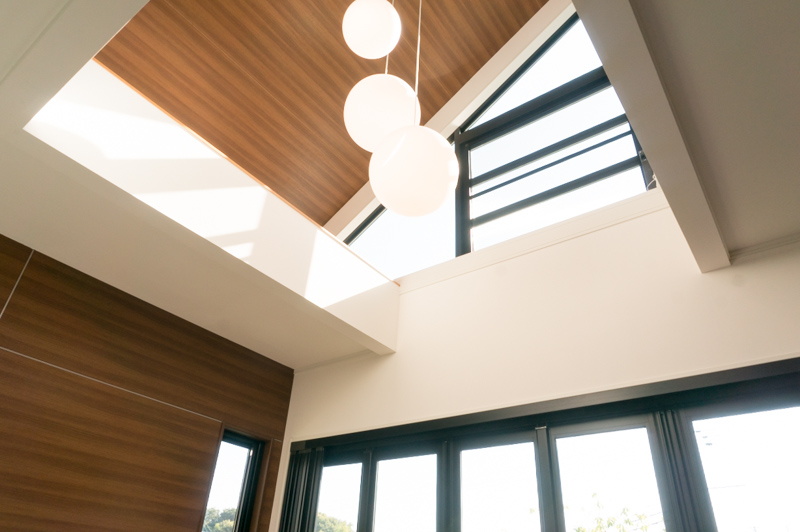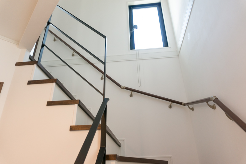 見上げると吹き抜け。そこにも窓。明るい自然光がサンサンと降り注ぎます