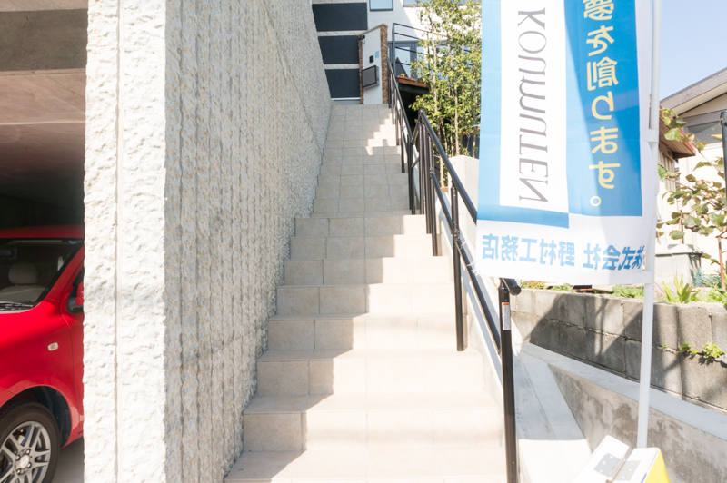 それでは、BOXガレージ横の階段を上って玄関へ向かいます。