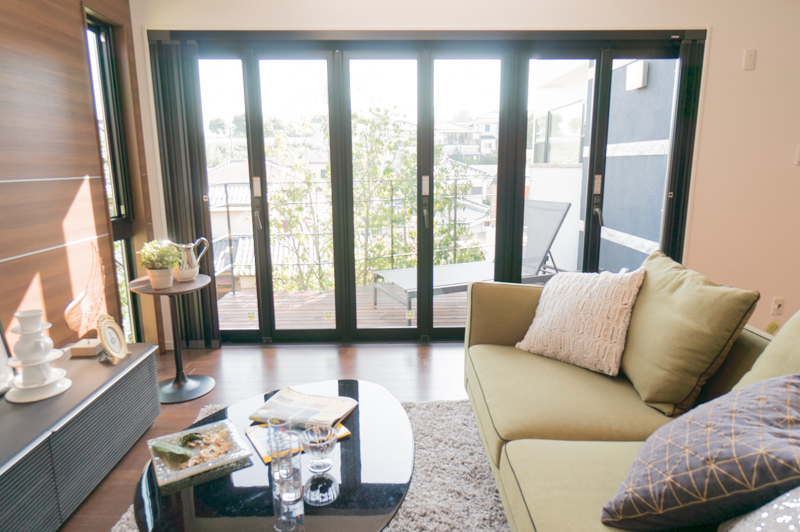 一面ガラスがこっちにも!ウッドデッキもあるLDK