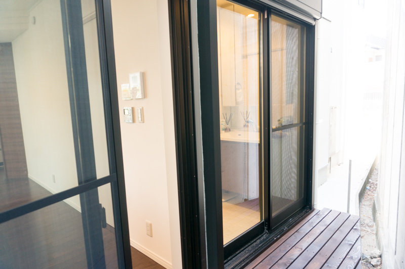 出てみると、ウッドデッキになっていて、お隣の洗面所と繋がっていました