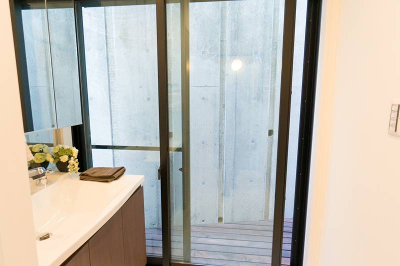 外でつながるキッチンと洗面所。