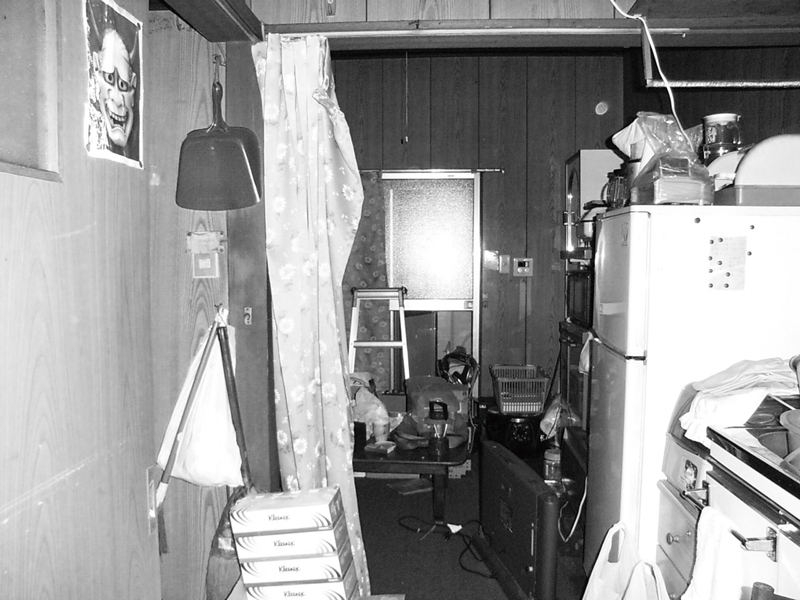 細く収納スペースがない感じがひしひし伝わってくるお部屋。左上の般若のポスターがより深刻な状況を助長しているような気がします。