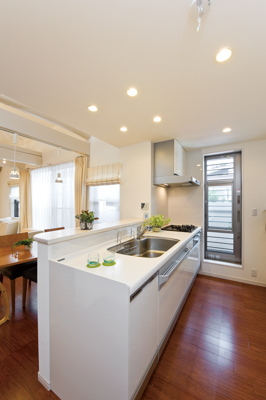 【子世帯用】広々としたオープンキッチン。白が基調で清潔感がありますね。